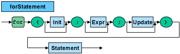 • Anfangs werden (Zähl-)Variablen (ggf. definiert und) initialisiert (Init). Solange die Schleifenbedingung (Expr) true ergibt, wird der Schleifenrumpf (Statement) wiederholt ausgeführtAnschließend werden die (Zähl-)Variablen aktualisiert (Update) und der Ausdruck erneut überprüft. Die Aktualisierung bedeutet häufig, das die Zählvariable um 1 erhöht wird (zaehler++)