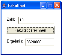 Die Fakultätsfunktion benötigt eine Ganzzahl (Datentyp int) und gibt ein long-Ergebnis zurück. Long wurde gewählt, da Fakultäten sehr schnell groß werden. Zunächst die grafische Oberfläche: