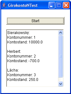 // Anfang Ereignisprozeduren public void btnStartActionPerformed(ActionEvent evt) { //Anlegen von Objekten der Klassen GirokontoN: GirokontoN sierakowskyKonto = new GirokontoN(3000); GirokontoN schaeferKonto = new GirokontoN(1000); GirokontoN lächaKonto = new GirokontoN(0); // "LächaKonto.Kontostand += 10000;" funktioniert nicht, wie man leicht // testet, da Kontostand als private deklariert wurde. //Transaktionen: sierakowskyKonto.GeldEinzahlen(10000); schaeferKonto.GeldAbheben(700); lächaKonto.GeldEinzahlen(250); //Ausgabe: tAAusgabe.append("Sierakowsky:\n"); tAAusgabe.append("Kontonummer: " + String.valueOf(sierakowskyKonto.KontoNrAnzeigen()) + "\n"); tAAusgabe.append("Kontostand: " + String.valueOf(sierakowskyKonto.KontostandAnzeigen()) + "\n\n"); tAAusgabe.append("Schaefer:\n"); tAAusgabe.append("Kontonummer: " + String.valueOf(schaeferKonto.KontoNrAnzeigen()) + "\n"); tAAusgabe.append("Kontostand: " + String.valueOf(schaeferKonto.KontostandAnzeigen()) + "\n\n"); tAAusgabe.append("Lächa:\n"); tAAusgabe.append("Kontonummer: " + String.valueOf(lächaKonto.KontoNrAnzeigen()) + "\n"); tAAusgabe.append("Kontostand: " + String.valueOf(lächaKonto.KontostandAnzeigen()) + "\n\n"); } // Ende Ereignisprozeduren