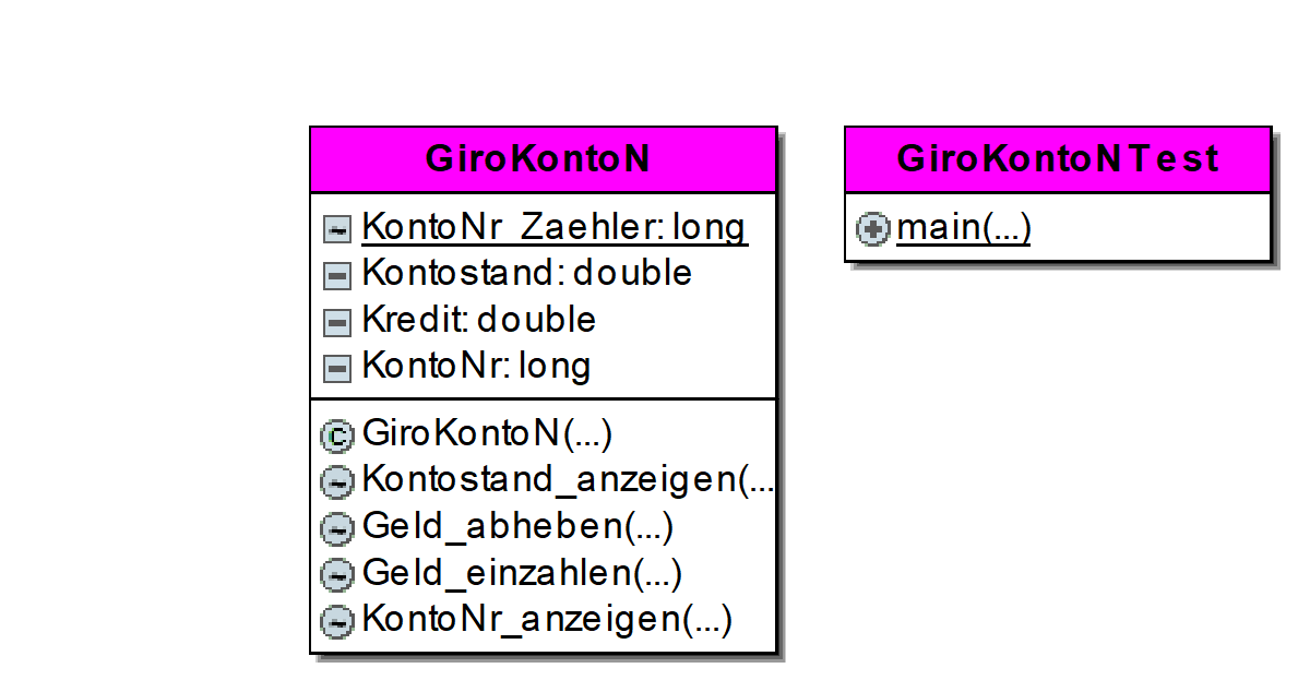 public class GirokontoN // Modifizierte Klasse Girokonto mit Konstruktor und Klassenvariable { private double Kontostand; // Zuerst die beiden Attribute der Klasse private double Kredit; private long KontoNr; static long KontoNr_Zaehler = 1; GirokontoN(double dispo) // Konstruktor, übergeben wird der Kreditrahmen { Kontostand = 0; Kredit = dispo; KontoNr = KontoNr_Zaehler; KontoNr_Zaehler++ ; } public double KontostandAnzeigen() // Methode // ab hier weiter wie im Programm in Kapitel 18