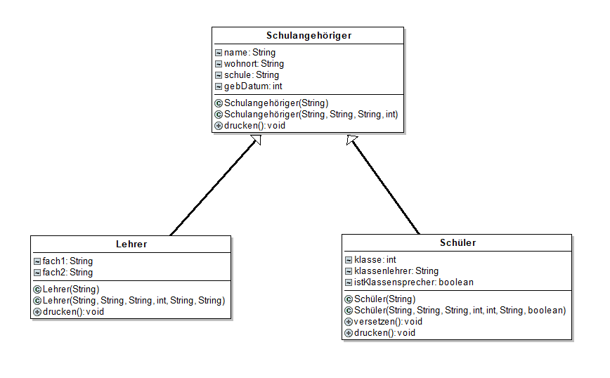 Die folgende Klassenhierarchie soll in Java erzeugt werden. Überlege Dir zwei sinnvolle Attribute und zwei Methoden für die Klasse Fahrzeug und implementiere sie mit Java. Teste die korrekte Funktionsweise z.B. mit einem Konsolen-Hauptprogramm.