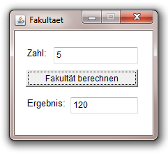 // Anfang Methoden long fak(int n) { if(n==1) // Abbruchbedingung der Rekursion return 1; else return n*fak(n-1); // Wenn n>1 ist, wird die Funktion erneut } // aufgerufen // Anfang Ereignisprozeduren public void jButton1_ActionPerformed(ActionEvent evt) { //Einlesen der Zahl: int zahl = Integer.parseInt(jTextField1.getText()); long fakultaet; //Rufe Funktion auf: fakultaet = fak(zahl); //Ausgabe: jTextField2.setText(Long.toString(fakultaet)); } // Ende Ereignisprozeduren