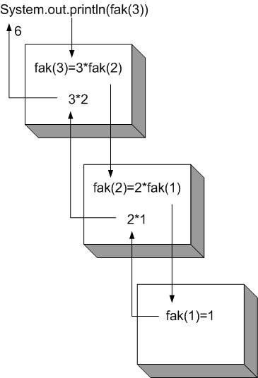 Das nebenstehende Diagramm zeigt den Ablauf der rekursiven Aufrufe für n=3. Jede Methode ruft rekursiv sich selbst als „Unterprogramm“ auf, ist selbst aber noch nicht abgeschlossen (Pfeile abwärts). Die Sache endet, wenn fak(1) aufgerufen wird. Jetzt wird der konkrete Wert 1 zurückgegeben, fak(1) ist beendet. Nun kann auch fak(2) fertig rechnen und wird beendet, usw. (Pfeile aufwärts).