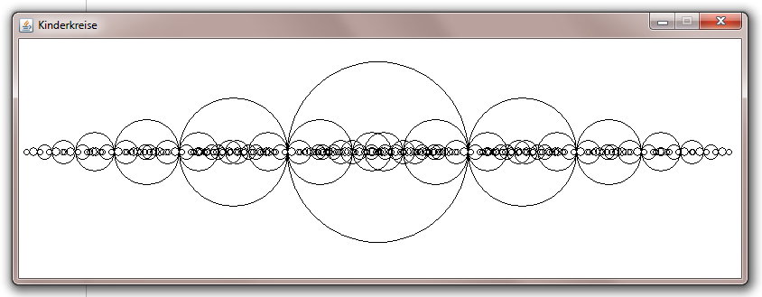 int y = 150; public void kinderkreis(double x, double radius, Graphics g) { // das Programm arbeitet für x-Mitte und Radius mit Kommazahlen // für die Zeichenbefehle sind int-Zahlen notwendig, // deshalb wird mit round gerundet und die entstehenden long mit (int) // in int gewandelt. g.drawOval((int)(Math.round(x-radius)),(int)(Math.round(y-radius)), (int)(Math.round(radius*2)),(int)(Math.round(radius*2))) ; // drawOval arbeitet als Parameter nicht mit den Mittelpunktskoord. // und dem Radius, sondern mit einem umbeschriebenen Rchteck. // Parameter 1 und 2 sind die Koordinaten des linken oberen // Rechteckpunkts. Parameter 3 und 4 sind Breite und Höhe des Rechtecks double neuerRadius = radius*0.6 ; // die Verkleinerung der Kinderkreise if(radius > 3) // Hierin steckt die Abbruchbedingung für die Rekursion { // nun kommen die rekursiven Aufrufe: kinderkreis(x-radius-neuerRadius,neuerRadius,g); kinderkreis(x+radius+neuerRadius,neuerRadius,g); // Hier steckt die Berechnung der Mittelpunkte der Kinderkreise drin } } public void paint(Graphics g) { kinderkreis(400.0,100,g); // Aufruf der Methode mit dem Startkreis // Mittelpunkt an der x-Position 400 und Radius 100 }