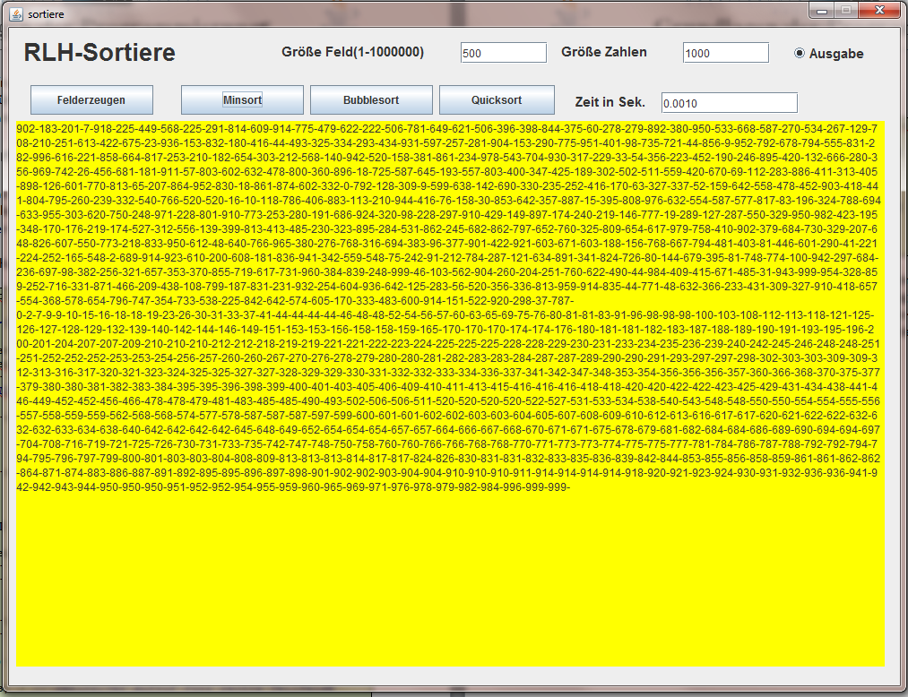 Zum Schluss noch die grafische Oberfläche, die auch die Zeitmessung und die beiden einfachen Sortierverfahren enthält. Mit dem Radiobutton kann die Ausgabe ausgeschaltet werden, da bei großen Feldern die Ausgabe des sortierten, bzw. unsortierten Teils ein Vielfaches der Zeit fürs Sortieren erfordert. Mit Zahlengrösse lässt sich der Umfang der Zufallszahlen einstellen, d.h. bei Eingabe 100 erhält man Zufallszahlen zwischen 0 und 99.
